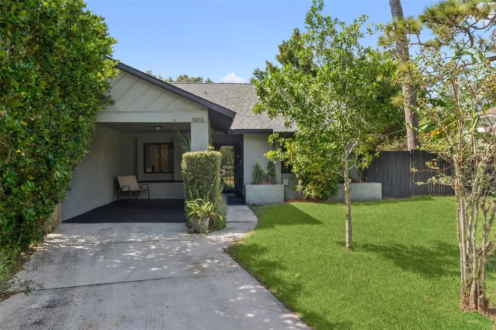 Welcome Home to 5450 Serene Lane! A well-maintained 3-bedroom, 2-bath duplex offering comfort, privacy, and a convenient location near Orlando. This home features tile flooring throughout, a split-bedroom floor plan, and an indoor laundry room. The kitchen is beautifully appointed with a black granite sink, tiled backsplash, and butcher block wood countertops. Bedroom 2 includes a barn door entry and wet bar, providing a unique and versatile space. Enjoy the outdoors in the screened and covered lanai or relax in the fenced backyard with additional patio seating. There’s also extra storage in the rear and a 1-car carport for convenience. The property backs to city-owned green space with no rear neighbors and a peaceful setting. Located in a quiet community with no HOA, this home offers both tranquility and accessibility—just a short drive to Orlando, shopping, dining, and major highways. Ideal for homeowners or investors seeking a low-maintenance property in a desirable Central Florida location.